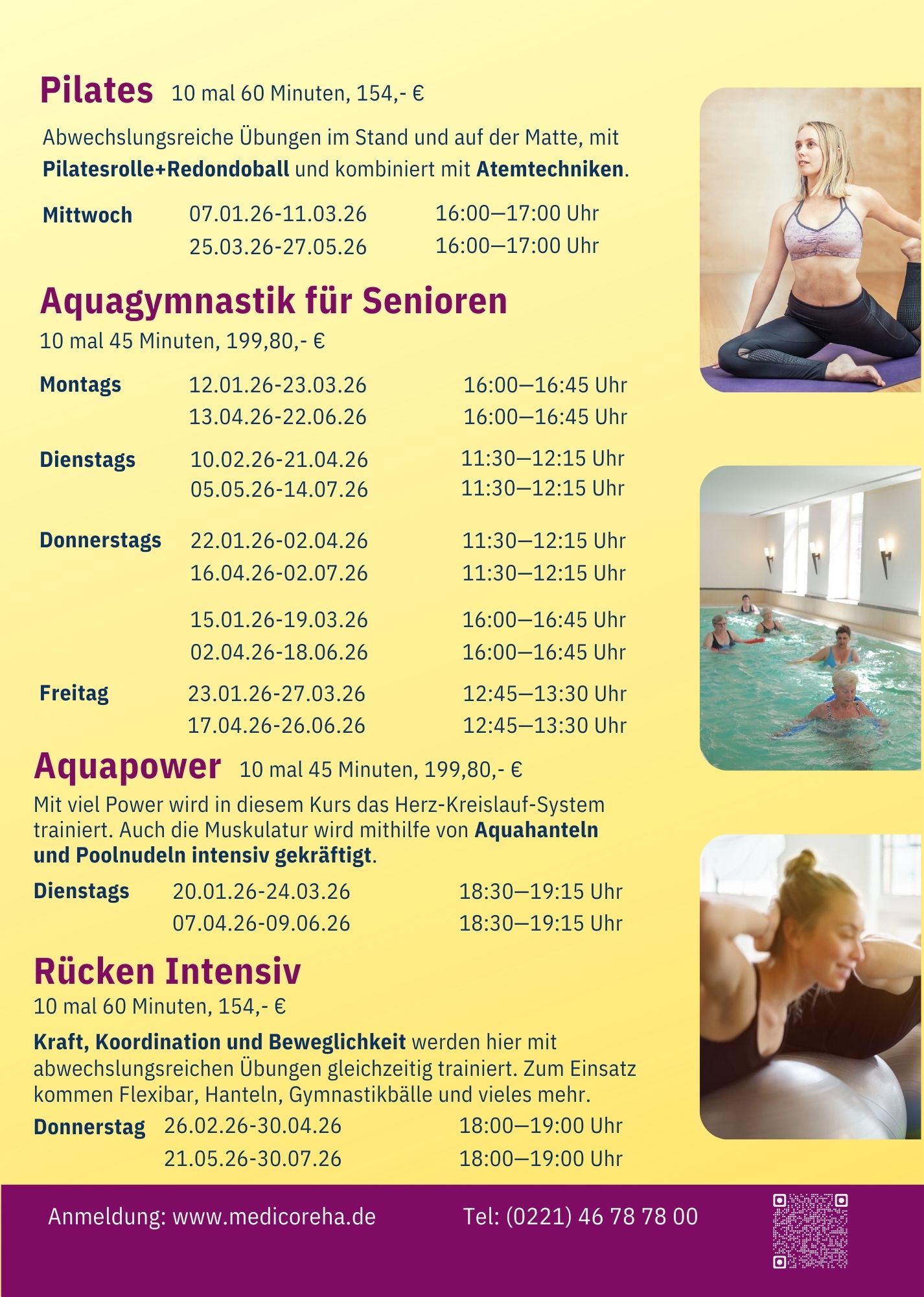 Suchen Sie sich einen Kurs aus und melden sich hier an. Von Pilates bis Wassergymnastik ist alles mit dabei! Kursprogramm 1. Hj. 2026.