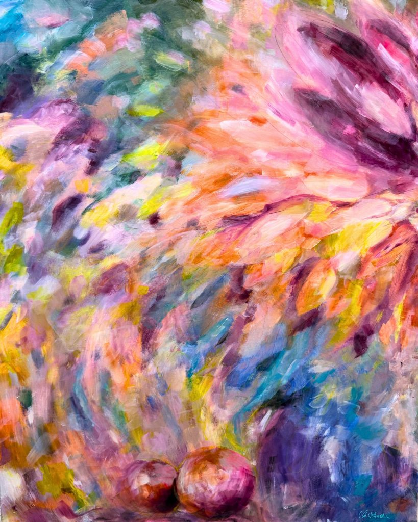 Die Tiefe meiner Bilder entsteht durch viele übereinanderliegende Farbschichten, die die Farben lebendig wirken und „tanzen“ lassen. Jeder Arbeitsschritt erfordert Zeit und Trocknungsphasen. Diese Pausen sind essenziel, sie schaffen Abstand zum Werk und Raum für neue Impulse.