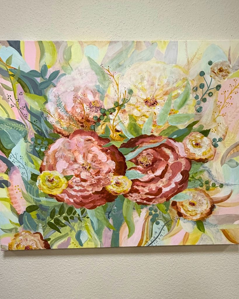 Ein weiteres Herzensprojekt von mir sind meine individuellen Auftragsarbeiten, die ich passend zum Wohnraum der Menschen gestalte. Dafür nehme ich den Charakter des Wohnraumes wahr. Mit Hilfe von Farbkarten bestimme ich die Farbtöne und setze sie dann in meinen Bildern um.