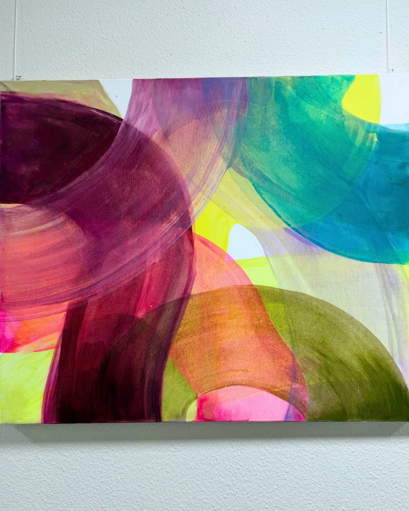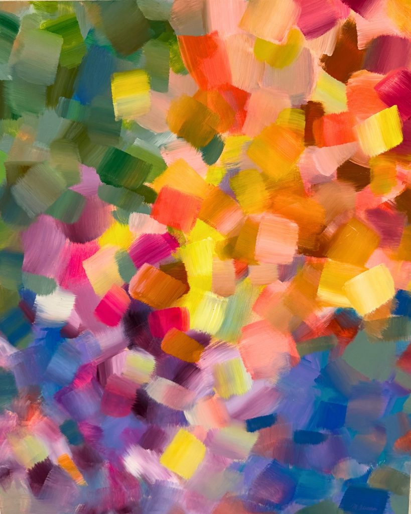 Die Tiefe meiner Bilder entsteht durch viele übereinanderliegende Farbschichten, die die Farben lebendig wirken und „tanzen“ lassen. Jeder Arbeitsschritt erfordert Zeit und Trocknungsphasen. Diese Pausen sind essenziel, sie schaffen Abstand zum Werk und Raum für neue Impulse.
