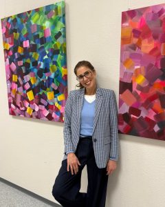 Als ich nach längerer Zeit wieder in der medicoreha in Rheydt eine Kollegin vertreten habe, fiel mir sofort die veränderte Stimmung rund um die Reha-Service-Stelle auf. Und diese war sehr positiv und vor allem farbgewaltig. Gemeint sind die neu ausgestellten, meist großformatigen Bilder an den Wänden. Nach einem kurzem Telefonat stand die Künstlerin Miriam Schwehn vor mir für ein spontanes Interview.