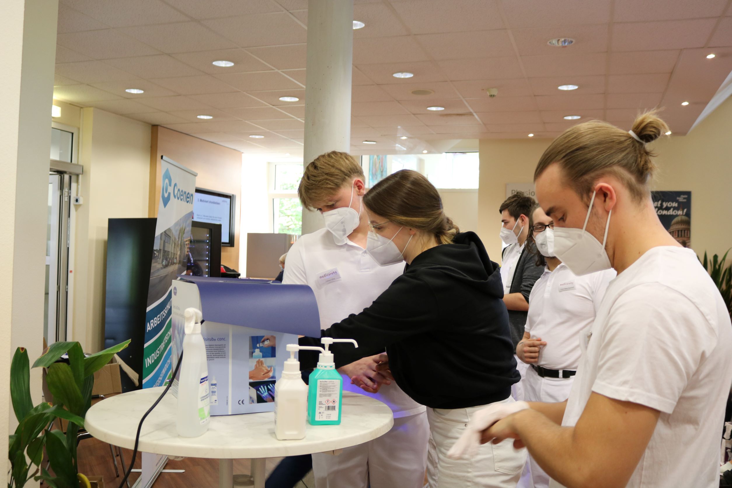 Wusstesn Sie, dass Einweghandschuhe nicht vor Vieren , Bakterien und Co schützen? Das war vielen Besuchern unseres Aktionsstandes zum Tag der Handhygiene am 05.05.22 auch nicht bewusst. Erst als sie Ihre leuchtenden Hände unter dem Schwarzlicht sahen (es leuchtet da, wo was durch den Handschuh durchgegeangen ist), wurde dies vielen klar. Also: nach dem Gebrauch von Handschuhe bitte die Hände Waschen oder desinfizieren und natürlich regelmäßig gut eincremen.