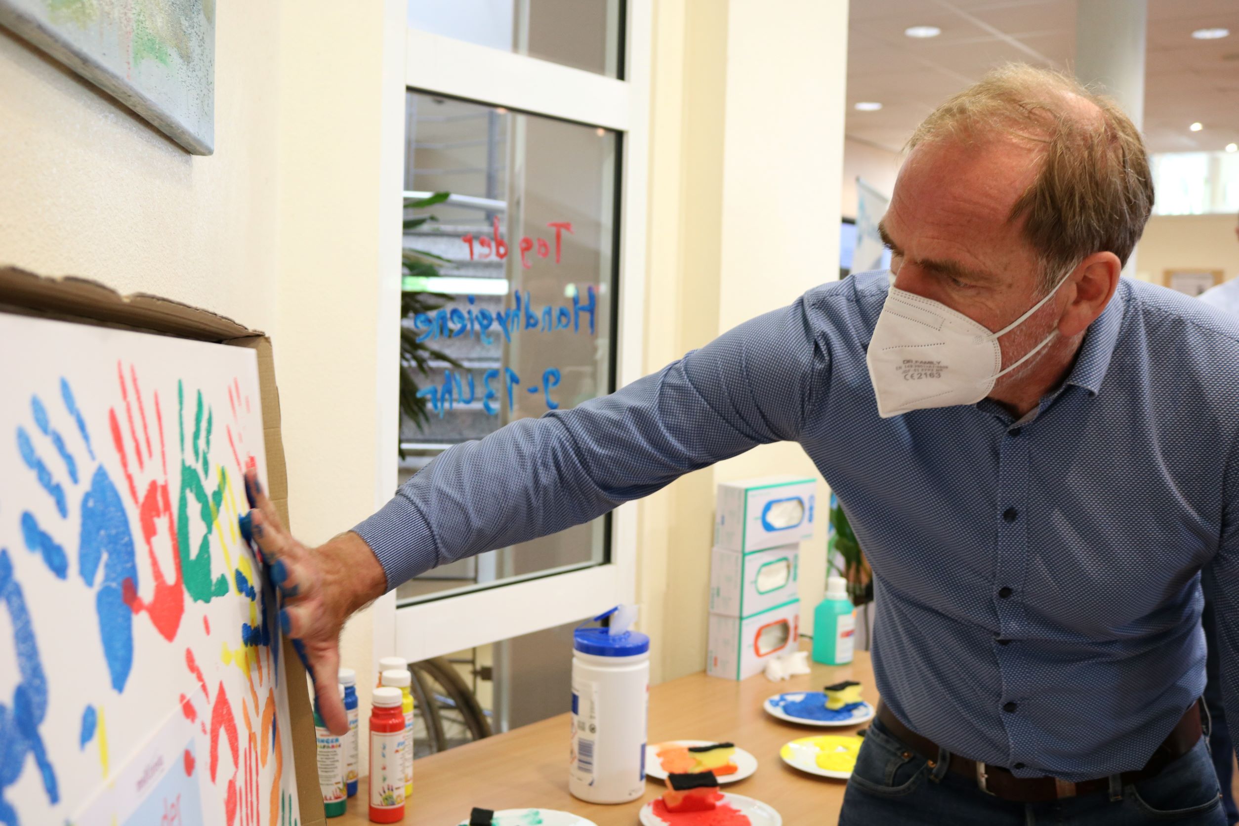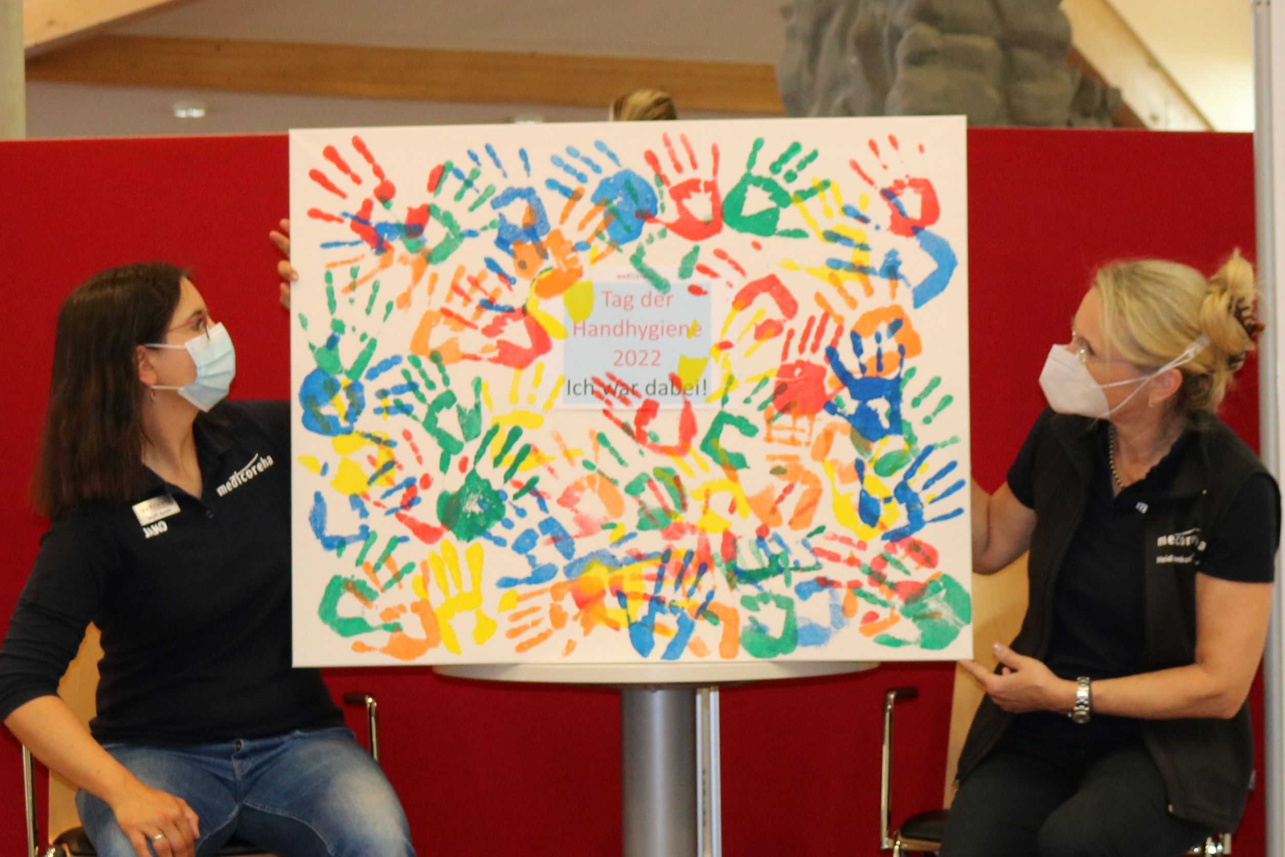 Insgesamt haben über 80 Patient*innen und Mitarbeiter*innen am Aktionstag teilgenommen und sich nach erfolgereicher Beratung mit einem bunten Handabdruck auf unserem Gemälde verewigt. Ein besondere Dank geht an unseren Kooperationspartner: Die Firma Coenen. Vielen Dank für die vielen Pröbchen und die super Beratung!